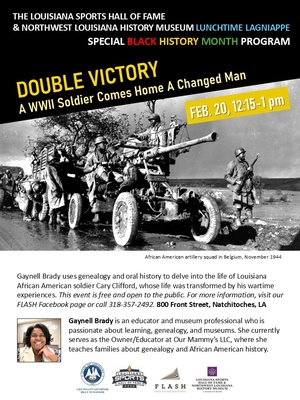 In this presentation, Gaynell Brady uses genealogical research and oral history to delve into the life of a Louisiana African American soldier. Cary Clifford was born on a plantation in Glynn, Louisiana. After fighting alongside thousands of enlisted men and officers in Europe, he returned home deeply affected by his wartime experiences.