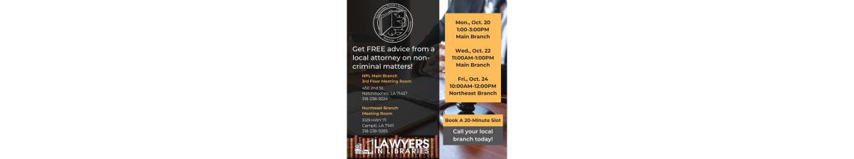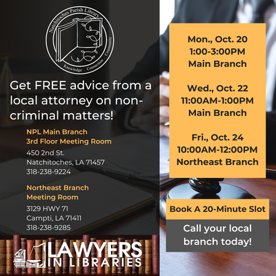 The Natchitoches Parish Library (NPL) is pleased to once again participate in the statewide "Lawyers in Libraries" program, in partnership with the Louisiana State Bar Association (LSBA), the State Library of Louisiana, and the Louisiana Library Association (LLA). Now in its 12th year, this important initiative connects Louisiana residents with local attorneys for free legal information and resources.