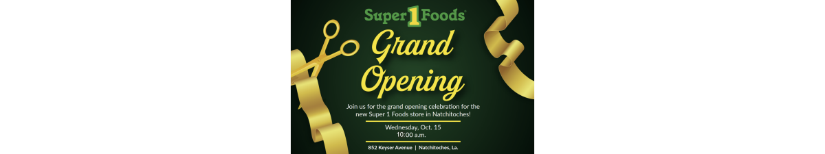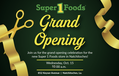 Super 1 is proud to announce the grand opening of the new Super 1 Foods in Natchitoches! The ceremony is scheduled for Wednesday, October 15 at 10 am and they would love you to join the celebration.